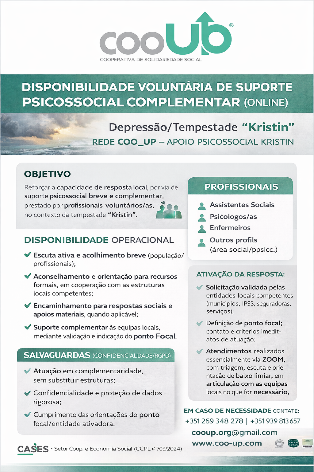 Esta iniciativa dirige-se à população afetada pela depressão/tempestade Kristin, com especial atenção a pessoas em situação de maior vulnerabilidade, bem como a profissionais e equipas no terreno que necessitem de apoio psicossocial ou orientação para encaminhamentos.